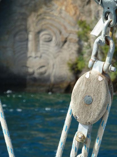 Wir fanden die Broschüre für eine nette Segeltour auf dem See, die auch an Riesen-"Maori-Carvings" vorbeiführen sollte. Genau das Richtige!