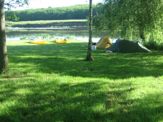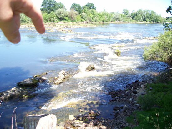 Wieder ein strahlender Morgen, also noch kurz gefrühstückt und dann ab aufs Wasser. Heute war geplant bis Thareau zu kommen, laut DKV-Führer von Diou aus 30km entfernt. Doch schon gleich zu Beginn stand eine Hürde an. Jean-Pierre hatte uns darauf hingewiesen, dass hinter Diou 3 Kaskaden den Fluss nur schwer befahrbar machen und man sich im Zweifel lieber die Füße nass machen und mit den Kanus treideln sollte, anstatt mit dem auf dem Fluss zu kentern. Kurz hinter Diou hörten wir bereits kräftige Wasserrauschen, sehen konnten wir zugegebenermaßen noch nichts. Trotzdem landeten wir mit beiden Kanus am rechten Flussufer an und Les und ich gingen am Ufer ca. 100 Meter vor, um die Kaskaden zu besichtigen.