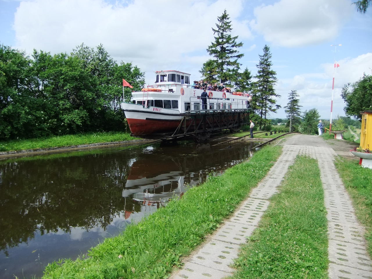 In Elblag muss natürlich das Schiffshebewerk am Oberländischen Kanal besichtigt werden. Das kann man per Schiff machen, die Fahrt dauert mindestens 6 Stunden, die Karten können über den Betreiber des Campingplatzes bestellt werden. In einem Reisebericht im Internet hatte ich jedoch gelesen, dass es eine Stelle am Kanal gibt, die mit dem Auto anzufahren ist. An dieser Stelle, so stand im Internet, soll der Transport der Schiffe über Land sehr gut zu sehen sein. Die ersten Schiffe erreichen diese Stelle ab etwa 10.00 Uhr. Die Geo-Daten lauten wie folgt: