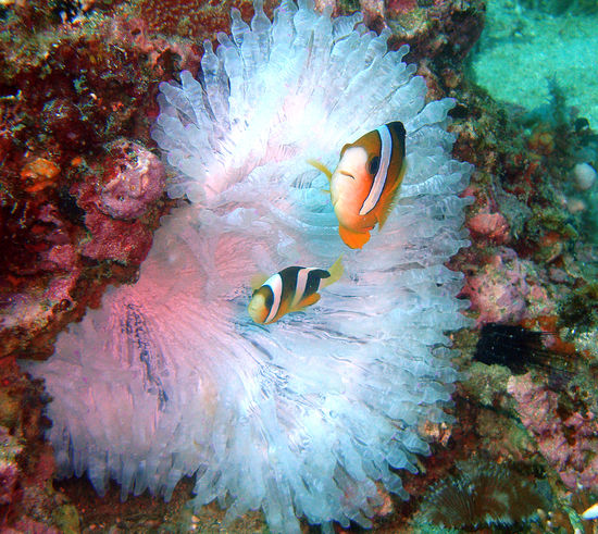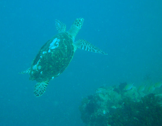 Natuerlich gehen wir direkt am naechsten Tag auch tauchen, um endlich mal unter Wasser zu kommen. Unglaublich fischreich das Ganze hier und irgendwie hauen die auch nicht ab sondern scheinen eher neugierig immer naeher zu kommen...was ja bei der Groesse noch okay ist. Wenn ein Hai ploetzlich so ein Interesse an mir entwickeln sollte wie der 40cm Fledermausfisch wuerde ich mir doch Sorgen machen. Wir sehen Schildkroeten, so nah, dass man sie anfassen koennte, Stachelrochen, riesige Schwaerme von allem moeglichem, und bei unserem 5.Tauchgang auch endlich mal unseren ersten Weissspitzen-Riffhai, ca.1.80 lang, ganz nah und in Farbe!!