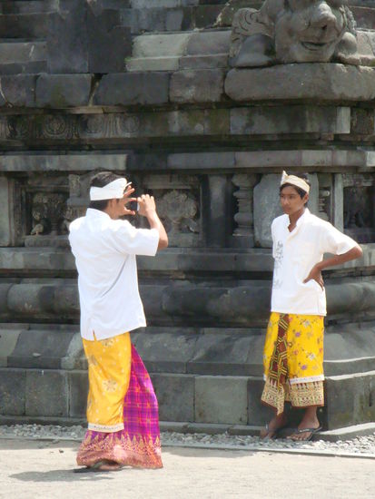 Am Prambanan wird das hinduistische Neujahrsfest mit einer riesigen Zeremonie gefeiert, ueberall laufen traditionell gekleidete Menschen rum, es sind ausser uns so gut wie keine Touristen unterwegs und gerade Ruediger muss sich mehrmals mit ganzen Familien fotografieren lassen und spaeter noch mit 4 Teenies, die ihn total cool fanden. Sehr lustig! "hey, strong man..."