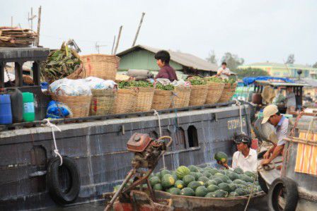 Wenn man früh genug aufsteht, kann man sogar an einem eigentlichen Reisetag noch ein Highlight erleben. Und für die Märkte zu Wasser war selbst uns das recht. So sind wir beim zweiten Weckerklingeln dann auch tatsächlich aus dem Bett, haben den Sonnenaufgang über dem Mekong erlebt, gefrühstückt und ausgecheckt und standen pünktlich um 07:00 Uhr vor dem Hotel. Schon als wir den ersten Blick bei der aufgehenden Sonne aus dem Fenster warfen, herrschte reges Treiben auf der Straße. Es wurde mit irgendeinem Gerät gekickt, natürlich ein Süppchen gekocht, fahrbare Untersätze mit frischem Blattgemüse durch die Straßen manövriert. Aber hey - es ist Sonntag und noch nicht mal ganz 06:00 Uhr!!!
