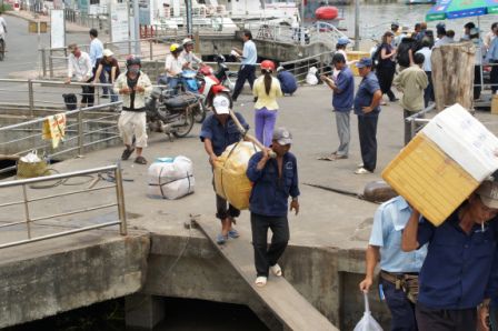 Nach unserer Rückfahrt blieb nicht mehr viel Zeit. Schon stand der Bus bereit, der uns ins etwa 113 km entfernte Rach Gia bringen sollte, von wo aus um 13:00 Uhr die Fähre nach Phu Quoc ablegte. Die Fahrtzeit war mit 3-4 Stunden angegeben. Einmal gab es unterwegs die Happy-Room Pause, dann wurde die rasante Fahrt fortgesetzt. Wir lagen gut in der Zeit und waren kurz nach 12:00 Uhr an der Anlegestelle. Wir zeigten unsere Tickets vor und wurden entsprechend auf dem Oberdeck platziert. Nix da mit Platz selber suchen. Muss schon alles seinen geordneten Gang gehen. Wir beobachteten die Verladevorgänge äußerst gespannt. Über ein schmales Holzbrett wurden Kartons, Körbe, Eierstiegen und sogar Mopeds auf die Fähre gebracht.