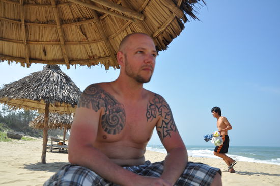Evi enspannt waehrend dessen am Pool Abends geht es dann zur Anprobe der geschneiderten Klamotten. Jetzt sitzt alles perfekt. Als Trinkgeld fuer die Verkaeuferin gibt es Evis alten H&M Pulli. Sie freut sich riesig. Morgen Abend geht es fuer uns weiter ins ca. 500 km entfernte Nha Trang. Vorher werden wir uns einen Roller leihen und zum Strand und My Son fahren.