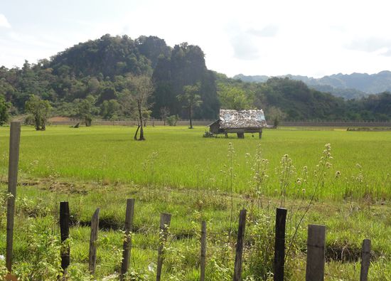 Losgehts... Die Landschaft in Zentrallaos ist durch die vielen Felsen, Berge und Huegel sehr beeindruckend.