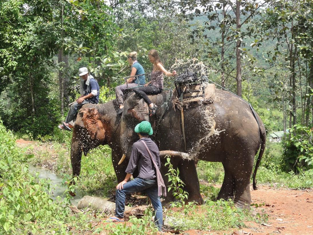 Später schauen wir uns noch ein Dorf eines Karenstamms an und fallen abends total erschöpft in unsere Betten. Während dem Nachtessen gabs etwa 10 Meter entfernt von uns plötzlich ein Feuerwerk. Kurzschluss beim Strommast und damit ist der Strom für diese Nacht weg. Dafür kommen jetzt die Glühwürmchen besser zur Geltung. Am nächsten Morgen geht's natürlich schon früh wieder los. Unsere Elefanten erheben sofort den Rüssel als sie uns sehen es scheint als sei ihnen unser Duft bekannt. Wir haben ja schliesslich auch extra kein Deo benutzt damit sie uns wieder erkennen; sehr wichtige Mahoutweissheit! In der brütenden Hitze machen wir uns auf zu einem langen Ritt durch den Dschungel, was vor allem für Annina wieder viel Arbeit bedeutete. Dieses Mal erwischte es aber auch mich und mein lieber Elefant lief mit mir auf dem Rücken quer durch Büsche und Bäume. Wir haben gelernt wie wir uns da auf den Elefantenrücken legen sollten aber trotzdem waren wir voll von Blätter und Ameisen. Natürlich war es auch für die 2 Elefanten ein heisser Tag und sie freuten sich über jedes kleine Bächlein das wir fanden. Dann wird eine grosse Portion Wasser, am liebsten noch mit ein bisschen Schlamm, in den Rüssel gesaugt und dann über den Körper und die ganze Haut gespritzt. Bitte vergesst nicht: Wir sassen immer noch oben auf dem Rücken Annina nahm den Hüften zuliebe auch mal im Korb Platz und erholte sich vom anstrengenden Führen. Den Korb tragen die Elefanten, damit sie gewöhnt bleiben falls es mal gebraucht wird. Übrigens empfehlen wir eine dicke Stoffhose anzuziehen denn die süsse, schrumpelige Haut des Elefanten hat unglaublich viele kratzige, lange Haare. Nur so falls ihr nächstens Mal auf einen steigen solltet.