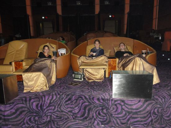 Unser Ticket erlaubte uns den Zugang zu einer eigenen Lounge wo wir mit Welcomedrinks bedient wurden. Danach gings in den Kinosaal indem ca. 24 Personen platz haben. Im verstellbaren Liegesitz und Gottseitdank mit Decken (es war wieder einmal unglaublich runtergekühlt) genossen wir den Film.
