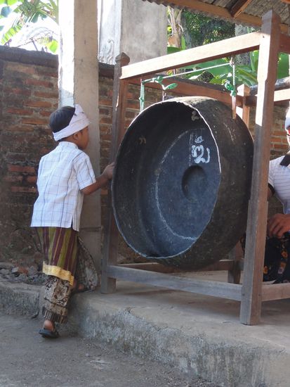 So trafen wir Harry am nächsten Morgen früh um sieben (schon wieder...) und er fuhrt mit uns zu seinem Elternhaus, welches in einem kleinen Dorf oberhalb von Lovina liegt. Dort wurden wir von der so netten Familie empfangen und die Mutter half uns unsere Sarongs richtig anzuziehen. Danach gings zum Tempel. Die ersten 1.5 Stunden wurden im Tempel von den älteren Dorfbewohnern heilige Texte vorgesungen. Man muss sich das ganze als eine Art Sprechgesang vorstellen, welcher manchmal auch etwas schräg tönt Alle Dorfbewohner sammeln sich im Tempel und die Stimmung ist sehr gelöst. Es wird geplaudert, geklatscht und gelacht. Vor dem Tempel spielt eine Gruppe von Männern auf einheimischen Instrumenten. Für uns klang es ein bisschen wie eine Guggenmusik