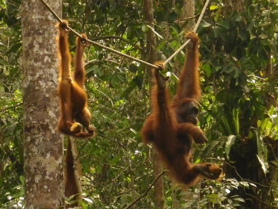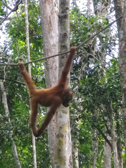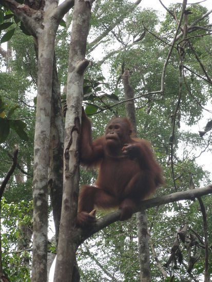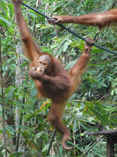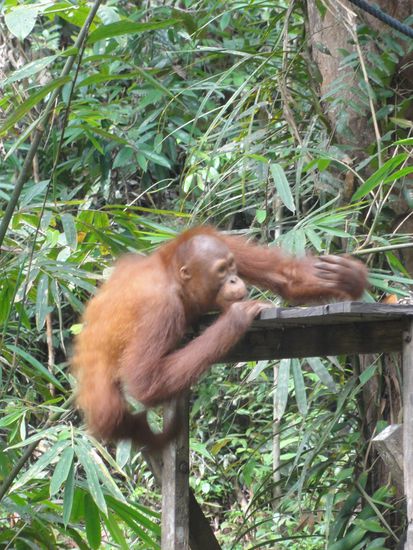 Ein schnelles Mittagessen, dann wollten wir die Orang Utans sehen. Mit dem Bus fahren wir zum Center, wo in einem riesigen Nationalpark über 20 der Affen gehalten werden. Diese leben frei aber 2 Mal am Tag gibt es Futter und das an einem bestimmten Ort, weshalb die Chance riesig ist dass wir sie dort zu sehen bekommen. So wars dann auch, bereits bei unserer Ankunft waren 3 beim Mittagessen. Wir konnten sie von ziemlich nahe beobachten und hunderte von Fotos schiessen.