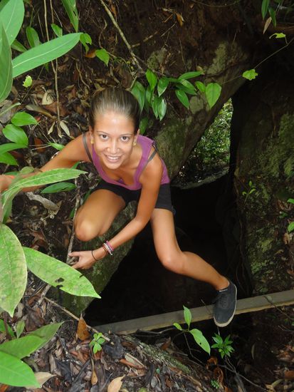 Unglaublich ich trekke in den letzten Tagen was das Zeug hält . Mit Joe und einem Einheimischen aus dem Longhouse geht's sofort steil in den Dschungel hinauf. Der Longhousebewohner kennt und sieht alles. Spuren von Affen und überall etwas essbares. Wir essen einem Baumstamm, Grässer und Beeren. Und dann plötzlich rennt er los und reist einen ganzen Bambusast runter und hält ein kleines Loch zu. Als er die Hand hebt kommen kleine Fledermäuse hinaus. Wir sammeln die ganze Zeit junge Bambussträucher und schleppen sie mit uns, diese soll es dann zum Abendessen geben. Als wir erschöpft wieder am Fluss ankommen, nehmen wir gleich ein kühles Bad. Und nun sind die Schwimmwesten mal ganz praktisch. Wir lassen uns treiben....