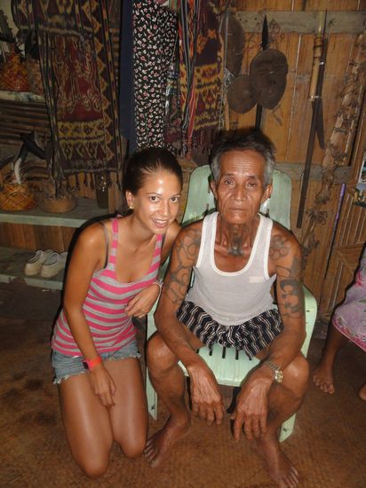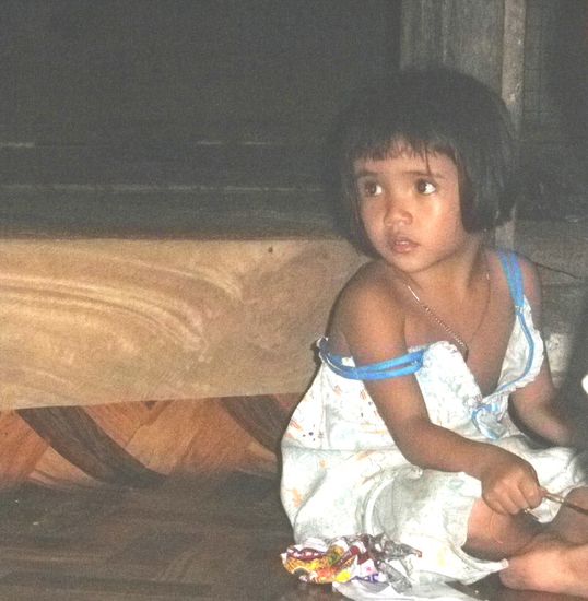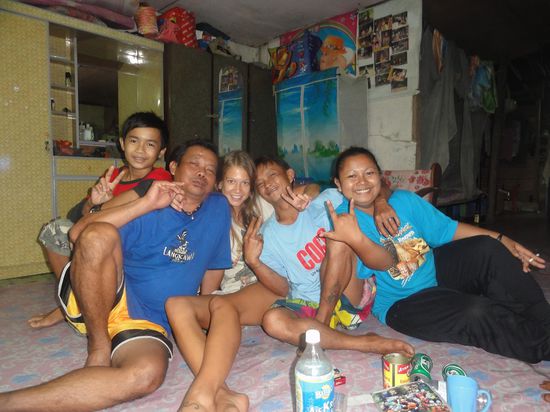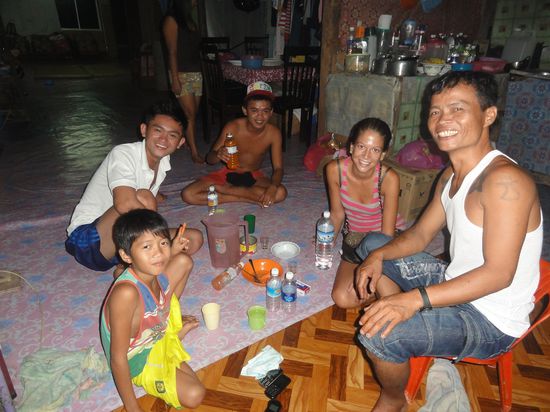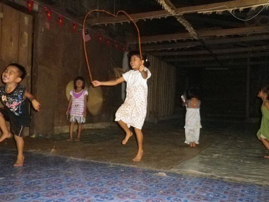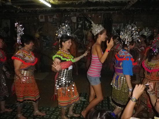 Als wir am späteren Nachmittag wieder ins Longhouse zurückkehren herrscht gleich eine ganz andere Stimmung. Alle Bewohner wollen wissen wie unser Trekking war, Fotos angucken, spielen und trinken. Es lohnt sich auf jeden Fall mehr als nur eine Nacht zu bleiben, denn nach einer gewissen Angewöhnungszeit öffnen sie sich total. Der Abend wurde lang und lustig. Wir haben gegessen, Karten gespielt, gesungen, getanzt, uns mit Händen und Füssen unterhalten und natürlich unmengen von Reiswhisky getrunken.