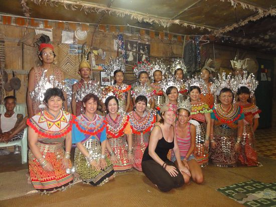 Natürlich wollten auch wir eines der berühmten Longhouses Borneos besuchen. Das bekannteste und ganz in der Nähe von Kuching ist das Annah Rais Longhouse. Wir hatten aber gehört dieses sei ziemlich von Touristen überlaufen und da wir eh noch mal in den Dschungel wollten buchten wir eine 3 tägige Dschungeltour mit Übernachtung im Lemanak Longhouse. Früh morgens gings mit unserem Guide Joe und seiner Frau los. Die 4 stündige Busfahrt unterbrachen wir mit Markt- und Farmbesuchen. Die letzte Stunde fährt man dann in einem Longboot durch den Dschungel. Ich hatte viel vom berühmt berüchtigten Reiswein und Reiswhisky in den Longhouses gehört und tatsächlich als Begrüssung wird gleich ein Glässchen getrunken. Im Longhouse in Lemanak wohnen 37 Familien. Es besteht aus einem riesigen Wohnraum, der offen ist, wo man leibt und lebt und ein paar geschlossenen Räumen mit Küchen. Wir wurden einer Familie zugeteilt und schon am ersten Abend mit einem der besten Essen dass ich je hatte bekocht. Etwa 10 verschiedene Gemüsesorten, Fleisch, Fisch und Reis. Mmmhh... Am Abend führen uns die jungen Mädchen noch einen Tanz auf, der aber wohl mehr für Touristen erfunden wurde. Und dann wird gemeinsam getanzt und vorallem getrunken... Nein sagen geht in diesem Haus unmöglich. Ich halte mich so gut wie möglich zurück, den am nächsten Morgen geht's mal wieder Trekken.