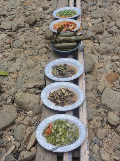 Während unseres Trekking haben zwei Frauen unser Mittagessen gekocht. Am Flussufer bereiten sie wieder unzählige Gemüse, Fisch und Chicken zu. Gekocht wird alles in Bambusrohren. Mmmmhhhh es war wieder super fein.
