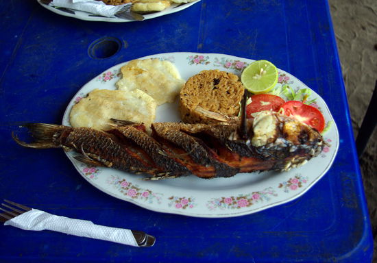 Eine einzige einfache Holzhütte wo wir frisch gegrillten Fisch zu essen bekamen, ein Baby in der Hängematte, ein zahmer Tukan am Baum.