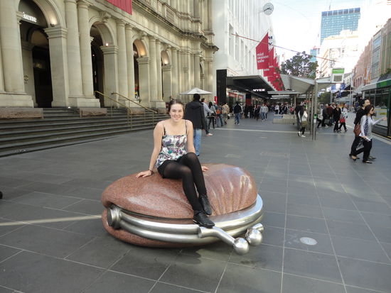Die ersten 5 Nächte sind wir in einem Hostel im Zentrum von Melbourne abgestiegen. Weil der erste Tag Karfreitag war hatten leider alle Läden zu, haben uns dann das Museum of the moving image angeschaut, alles was mit Film, Medien usw. zu tun hat, und sind recht früh ins Bett weil wir noch ziemlich geschlaucht waren von den letzten Tagen. Das Museum war aber echt superinteressant. Am zweiten Tag haben wir uns dann auf ins DFO (Direct Factory Outlet) gemacht und erst mal ordentlich geshoppt, is ja auch Zeit geworden Waren auch beide sehr erfolgreich und haben jetzt viele neue (und natürlich nur notwendige) Sachen. Am Abend haben wir uns mit ein paar Leuten getroffen, mit denen wir die GOR Tour gemacht haben und waren ein bisschen feiern. Erst waren wir in einer ganz tollen Bar auf dem Dach mit super Ausblick über ganz Melbourne und danach noch in einem Club von dem wir Gutscheine für 1 Getränk und freien Eintritt hatten... jedes Bier danach kostete aber halt malschöne 9$...