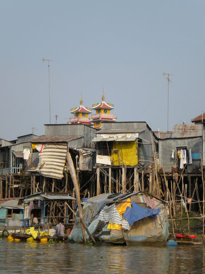 Der Pick-Up-Service vom Hotel entpuppte sich als Cyclo, das mit zwei Europäern mit Gepäck eindeutig voll besetzt war . Das Slowboat bis zur Grenze war ein gemütliches Motorboot mit Polstersitzen und freundlichem Guide. Wir tuckerten gemütlich drei Stunden bis zur Grenze und machten dabei geschätzte zweihundert Fotos von Wasserbüffeln, Hausbooten, Reistransporten und Stelzen-Hütten. An der Grenze warteten wir eine gute Stunde auf einer schwimmenden Plattform, dann holte uns ein kambodschanisches Motorboot ab. Vier Formulare und acht Stempel später reisten wir offiziell ein. Unser Boot war nicht das grösste und auch sicher nicht das komfortabelste, dafür konnte es in punkto Lautstärke alle anderen übertrumpfen!