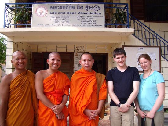 Nach dem Rundgang wurden dann zur Mensa gebracht. wo unser 1. Patenkind, Tong, schon auf uns wartete. Ein komisches Gefühl, den kleinen Kerl in echt zu sehen, kam mit einen Lächeln und einen ganz schüchternen "Hello" auf uns zu und umarmte uns. Unser 2. Patenkind, Mon, kam etwas später, da sie einen Schulweg von etwa einer Stunde (mit dem Fahrrad!) hatte. Auch sie begrüßte uns mit einem "Hello" und einer Umarmung. Leider viel die Kommunikation noch etwas schwer, da beide erst das erste Jahr Englisch hatten, aber mit Händen und Füßen ist ja bekanntlich alles möglich. Wir wurden anschließend vom Direktor der Schule zum Essen eingeladen. Es gab ein Gemüse in einer Art Brühe mit Knoblauch und etwas Hühnchenfleisch. Zu unserem Tisch gesellte sich dann noch der Englischlehrer der Schule dazu uns so entwickelte sich eine sehr interessante Unterhaltung. Leider konnte ich nicht allzuviel Essen, da mein Magen etwas Probleme machte und dementsprechend etwas rebellierte. Konnte aber auch doch etwas mit der generellen Aufregung des Tages zu tun haben. Nach dem Essen gings dann zum CDV, dem Childrean Developement Village, dass nur wenige Fahrminuten zur Schule lag. Dort werden Waisenkinder betreut und wohnen dort in verschiedenen Häusern. Sehr viele liebe Kinder und eine sehr schöne Atmosphäre. Danach besuchten alles zusammen (wir waren insg. 9 Leute) die Familien unserer Patenkinder. Als erstes kam die Familie von Tong dran. Spätestens dort erkannte man dann, wie wichtig es ist, diesen Famlilien durch Ermöglichung von Bildung zu helfen. Eine einfache kleine Holzhütte mit Feuerstelle, mehr nicht. Leider war auch dort wieder die Sprachbarriere aber zum Glück dolmetschte uns der Direktor der Schule, sodass wir auch zu den Eltern und zu Tong selbst natürlich reden konnten, sodass sie uns verstehen. Nach der Verabschiedung gings weiter zu Mons Familie. Dort erwartete uns ein ähnliches Bild, eine einfache Holzhütte. Doch was mehr heraustrat war die Herzlichkeit der Familie, wie wir empfangen wurden. Mons Mutter bedankte sich dann auch nochmal extra bei uns, dass wir ihrer Familie helfen. Zur Verbaschiedung schenkten wir Mon sowie Tong ein kleines einfaches Freundschaftsarmband mit dem Versprechen, dass wir sie nächstes Jahr wieder besuchen werden und versuchen werden, mehr Zeit für sie und die Schule zu haben. Die Verabschiedung von den Familien und dem Direktor viel sehr schwer, da alle so liebenswürdig und offen zu uns waren, aber wir mussten noch den anstrengenden Heimweg zurücklegen.