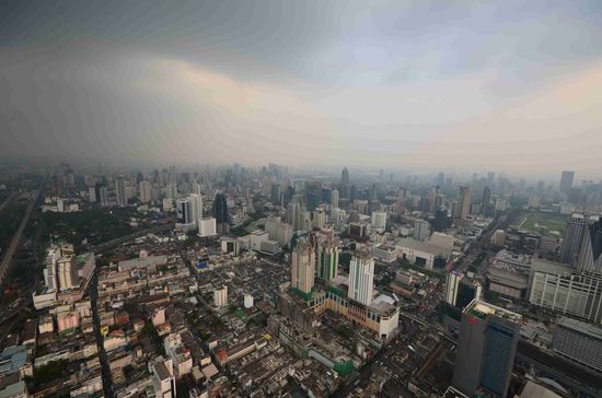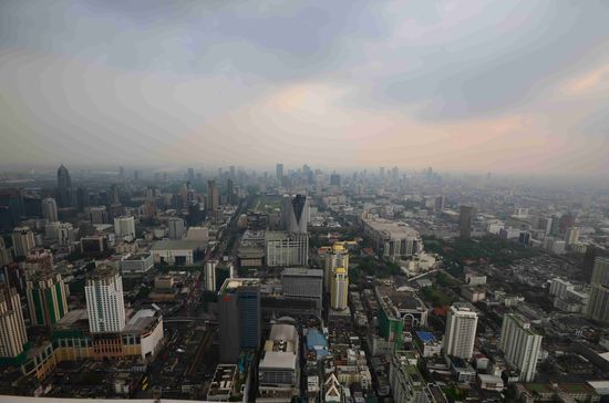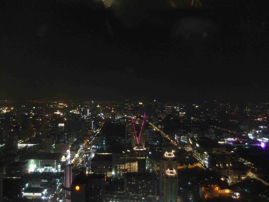 Nach gut 4 Stunden sind wir wohlbehalten wieder in Bangkok am Bahnhof. Von dort fahren wir mit einem Taxi zum Baiyoke Sky Hotel, unserer Bleibe für die letzten 2 Tage. Der Baiyoke Tower ist mit ca. 300m das höchste Gebäude Südostasiens und hat 84 Etagen. Unser Zimmer befindet sich im 58. und wir müssen einmal umsteigen, um unser Zimmer mit dem Fahrstuhl zu erreichen. Das Zimmer ist gut ausgestattet, leider ist der Blick wegen sehr kleiner Fenster, vor denen auch noch Werbeplakate hängen, nicht so toll. Aber da kann man ja, wieder mit umsteigen, per Fahrstuhl nach ganz oben fahren, wo dann eine Aussichtsplattform ist, die sich in etwa 5 Minuten einmal rundherum dreht. Und hier ist der Blick natürlich gewaltig!