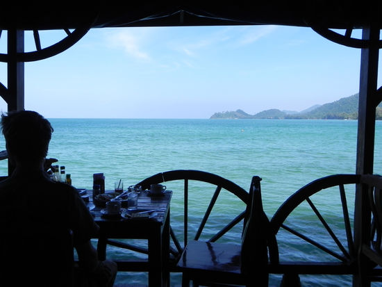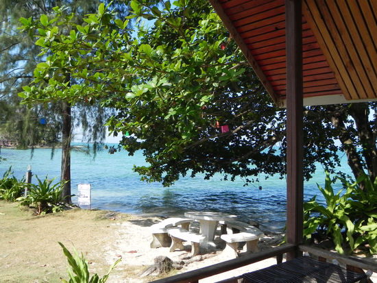 Thailand ist ein tolles Land und so gab es den Pass-Stempel diesmal wieder ohne Gebühren und unsinnigem Passbild. Im Minibus ging es weiter zur Küste nach Trat und von dort aus mit der Fähre nach Koh Chang. Hier haben wir uns zum erstem Mal gefragt ob es nicht sinnvoller gewesen wäre, ein Hotel vorzubuchen, denn Abends um 19 Uhr macht die Hotelsuche nur wenig Spaß. Wir suchten uns auf gut Glück irgendeinen Strandabschnitt (Kai Bae) aus und nahmen einfach die erstbeste (glücklicherweise gute) Unterkunft. (=Sea Breaze Bungalow / 800 Bath)