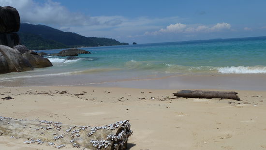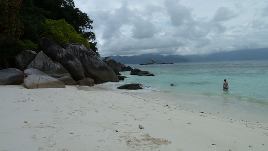 Nächster Halt unserer Reise sollte Tioman Island an der Ostküste der malaysischen Halbinsel sein... dafür ging es morgens mit dem Bus erstmal in 4 h (der Fahrplan wurde sehr genau eingehalten!) nach Mersing, wo wir gut zwei Stunden auf die nächste Fähre nach Tioman warten mussten. Diesmal wurde der Fahrplan allerdings nicht ganz so genau eingehalten und so verzögerte sich die Abfahrt doch noch etwas. Was nicht schlimm gewesen wäre, aber durch die Klimaanlage war es auf dem Boot doch sehr kalt, und draußen sitzen durfte man leider nicht. Aber irgendwann ging es dann doch los. Das Boot fährt immer die verschiedenen Piers der einzelnen Dörfer auf der Insel an, aussteigen kann man wo man möchte. Wir haben uns für das Dörfchen Air Batang entschieden und fanden hier auch sehr schnell eine schöne Unterkunft (Mokhtar's Place). Eine einfache, aber saubere Holzhütte, etwa 30 m vom Strand. Die Umgebung ist einfach traumhaft, ein hübscher - wenn auch bei Flut sehr schmaler - Strand, türkisblaues Meer, im Hintergrund dichter Wald auf Bergen, an denen meist Wolken hängen. Aber ich muss euch ja eigentlich nicht mit Worten neidisch machen, dafür eignen sich die Bilder ja viel besser