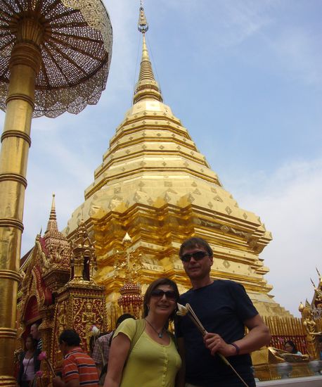 Dienstag vormittags verabschiedeten wir uns von Daniela und Martin. Wir fuhren dann zum Kloster Doi Suthep am Berg oberhalb von Chiang Mai, über einen Umweg, da ein nichtenglischsprender Tuk-Tukfahrer uns am anderen Ende der Stadt bei einem Busbahnhof absetzte und nach unserem Protest vor uns die Flucht ergriffen hat. Trotzdem sind wir noch im Kloster eingetroffern und haben an Dagi gedacht und für sie Lotosblüten niedergelegt. Inzwischen haben die Songkran-Vorfeiern begonnen. Nach 2x nass werden fuhren wir am Abend mit dem Nachtzug im Liegewagen nach Ayutthaya.