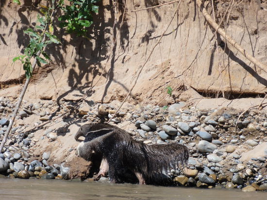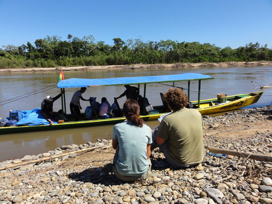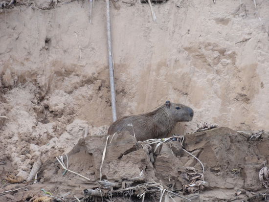 Am ersten Tag unseres Jungle Trips fuhren wir am Morgen mit dem Boot den Rio Beni hinauf in den Nationalpark Madidi, vorbei an Geiern und anderen Voegeln. Ab und zu kamen wir an Communities vorbei - kleine Ansammlungen von Haeusern, gefolgt von kleinen Plantagen. Wir bestaunten die Pflanzenvielfalt an den Ufern und entdeckten schon auf dem Hinweg einen Kaiman, einen Affen, viele Voegel und ein Capiguara.