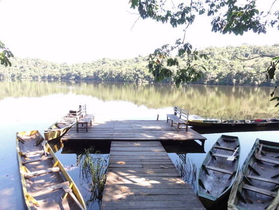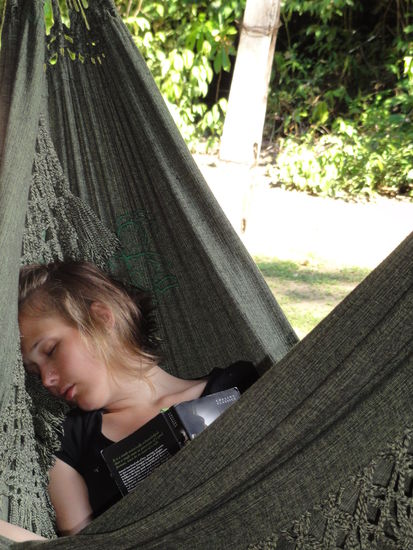 Nach einem kurzen Spaziergang kamen wir zur Lodge: ein kleines Dorf aus Mahagoni-Haeusern, ein grosser grasiger Platz mit Zitrusbaeumen und das Wichtigste, eine Lagune ganz fuer uns - insgesamt neun Touristen, geteilt in zwei Expeditionsgruppen. Ein junger Jungelbewohner eilte sogleich mit erfrischender Limonade zu uns und kurz darauf gabe es noch einmal einen Lunch. Mittlerweile hatte uns Yhovani in unsere Zimmer eingewiesen und uns das Jungle-1x1 verklickert: Schuhe erst kontrollieren, bevor man reinschluepft, in der Nacht immer mit Taschenlampe auf die Toilette, bei der Lagune bloss nicht zu den Straeuchern schwimmen... Auf die Abkuehlung hatten wir uns alle sehr gefreut, doch fragten wir skeptisch nach, was denn im Dickicht laure. Kaimane natuerlich! Doch bloss keine Angst, denn tagsueber schlafen sie und "anyway, they are very friendly." Mit Herzklopfen sprangen wir ins warme Wasser und schwammen ein paar Laengen in die Mitte. Es war traumhaft.