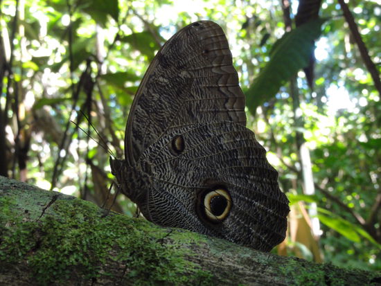 Wir sahen praehistorische Baeume mit Dornen, welche sie zum Schutze vor Dinosauriern entwickelt hatten, einen Baum, der wandert - auch wenn es Jahre dauert -, einen Baum, der von Feuerameisen bewacht wird und an welchen man frueher Leute zur Strafe gebunden hatte, bis sie gestorben sind und eine Strangula Fig - ein strangulierender Feigenbaum, welcher die Baeme von oben nach unten erwuergt. Uns haette die unglaubliche Vielfalt der Vegetation bereits gereicht, doch sahen und hoerten wir auch die Bewohner des fuenfstoeckigen Regenwaldes: Squirrel-, Howler-, Spider-, Capuccino-Monkeys, Tukane, Papageien und viele andere Voegel, Leaf-cutter-ants (Ameisen, die suesse Blaetterstuecke sammeln, um einen Pilz zu zuechten, den sie gerne essen), Bullet-Ants, einen platten Frosch und kleine gruene Froeschlein, die an Zweigen klebten, ein Tarantel, eine springende Spinne und eigentlich viel zu viele Spinnen, eine junge false Viper, kleine Kaimane und viele Schmetterlinge.