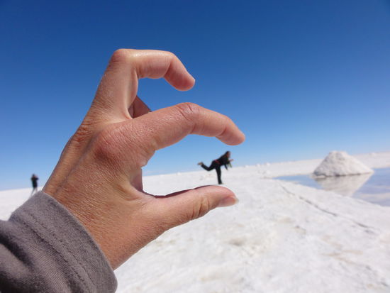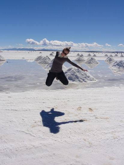 Gespannt waren wir alle auf den Salzsee. Nach einem kleinen Abstecher in ein Dorf, das aus Salz erbaut war, erblickten wir endlich die weisse Ebene, die sich in die Unendlichkeit zu erstrecken schien. Auf dem Salar machten wir Foto-Session um Foto-Session. Es war einfach zu schoen und unglaublich, um auch nur einen Aspekt aus unserer Bilderdokumentation auszulassen. Beim Hotel inmitten des Sees - dieses war natuerlich geschlossen - wurde auf einem Tisch aus Salz unser Mittagessen vorbereitet. Gestaerk und nur widerwillig nahmen wir Abschied von diesem unwirklichen Naturphaenomen.