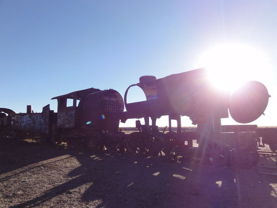 Es ging zurueck nach Uyuni, vorbei an einigen Pecuñas. Dort wurde das Salz vom Auto abgespritzt und dort verliess uns die Koechin, nachdem sie uns noch einmal vor einer Telefonkabine hat warten lassen. Egal. Unser Weg fuerte uns zum Zugfriedhof. Diese alten Wagen und Dampfloken wurden frueher zum Transport von Mineralien aus den Minen gebraucht, doch rosten sie nun schon lange vor sich hin. Jetzt sind sie eine Touristenattraktion und auch wir spazierten zwischen diesen alten Maschinen umher und fotografierten wie wild.