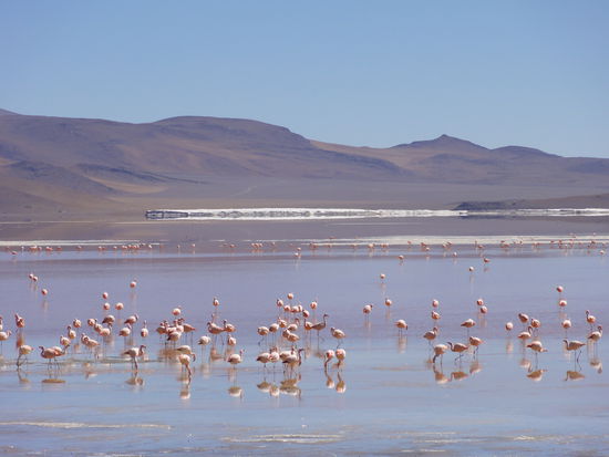 Nach einer kalten Nacht in einem Viererzimmer eines schaebigen Hotels mit nur einem WC fuer 12 Gaeste - die Dusche war im gleichen Raum wie die Toilette und das zu bezahlende Warmwasser war bestenfalls nicht eiskalt - fuhr Fredi mit uns durch bezaubernde Landschaften vorbei an Lamas und Pecuñas zur Laguna Colorado, wo Flamingos im roten Wasser umherwadeten. Etwas abseits des Touristenandrangs am Ende der Lagune beobachteten wir die rosanen Voegel beim Mitagessen und lernten unsere Mitreisenden kennen: zwei Franzosen und zwei Italiener. Bald ging es Weiter zu den Lagunas Blanco und Verde und von dort aus...