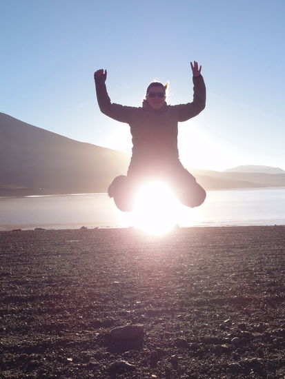 Schliesslich rief uns Fredi etwas ungeduldig zusammen und wir fuhren zur Unterkunft. Jetzt verstanden wir die Unruhe unseres Guides: bei den Unterkuenften gilt das Prinzip "first come, first serve". Am ersten Ort waren schon alle Betten belegt, so fuhren wir weiter bis zur Laguna Colorado, wo noch Zimmer frei waren. Den Abend verbrachten wir um ein Feuer in unserem Speisesaal und bei Wein und Spaghetti freundeten wir uns mit dem Italienerpaeaerchen an. Danach schliefen Rafaela und ich in einer Hoehe von 4700 m.ue.M. in einem Sechserzimmer, eingemummelt in zwei Schlafsaecke und ueberhaeuft mit allen Decken die uns zur Verfuegung standen - wir trotzten der Kaelte. Am morgen gingen Rafaela und ich sogar spazieren und erlebten einen wunderschoenen Sonnenaufgang in klirrender Kaelte, bevor das Programm weiterging.