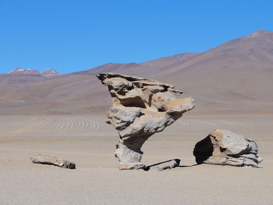 Am letzten Tag des Trips fuhren wir noch einmal durch geniale Landschaften, vorbei an Vulkanen und mit Halten bei den Árboles die Piedra, bei drei kleineren aber nicht miderschoenen Lagunen, bei einem Tal mit unzaehligen grossen Steinen und bei einem schoenen, sauberen Hotel zum Mittagessen, das nur einen Steinwurf von unserer ersten furchtbaren Unterkunft entfernt war. In San Cristobal gab es noch einen kurzen Stop und endlich kamen wir wieder in Uyuni an. Rafaela und ich verabschiedeten uns schnell, buchten den Bus nach Sucre fuer den naechsten Tag und konnten endlich wieder richtig warm duschen im Hotel, das wir zwei Tage zuvor reserviert hatten.