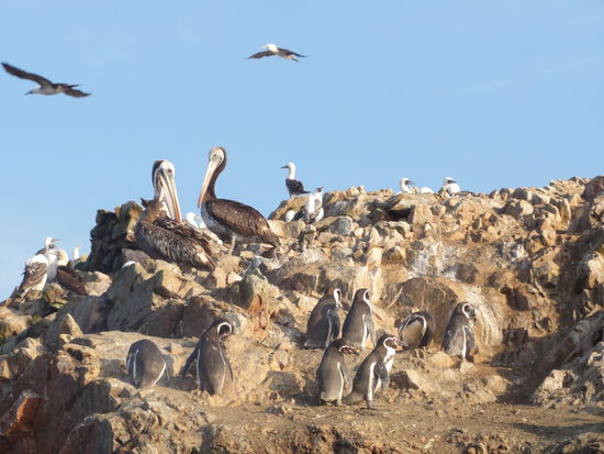 ...gelangten wir zu unserem felsigen Ziel. Tausende von Voegeln aller Art - Pelikane, Pinguine, Kormorane und viele mehr - tummelten sich auf, zwischen und ueber den Steinbrocken im Meer.