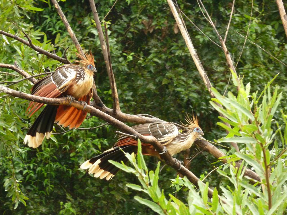 Am dritten Tag stiegen wir einen kleine Berg mitten im Dschungel hinauf,....oben angekommen standen wir an einer steil abfallenden Felswand . Unter uns der Dschungel,....Bäume soweit das Auge reichte. Hinten am Horizont schlängelte sich der Fluss auf dem wir gekommen waren wie eine Schlange durch die Ebene. In der Felswand und auf den Bäumen zig Papageie,....lautstark kreischend aber wunderschön. Von unserem Aussichtspunkt aus konnten wir sie sehen wie sie über die Baumgipfel flogen,...gemeinsam in Flugformationen oder auch einzeln. Ihre rot-blau-grünen Federn leuchteten in der Nachmittagssonne - ein Wahnsinnsausblick.