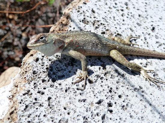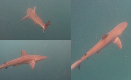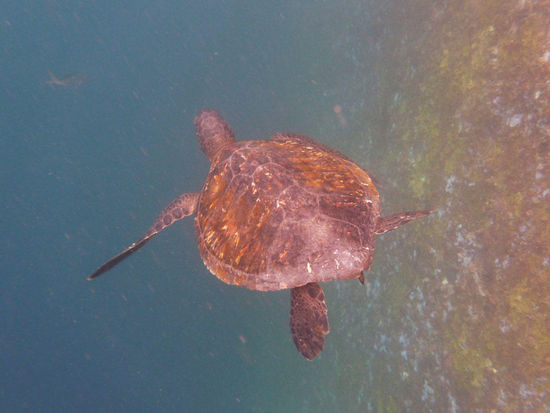 Als ich weiter vor mich hintreibe und mir die kleinen Fische in den Felsöffnungen näher betrachte, taucht wiederum ein Schatten im Sichtfeld auf. Innerhalb von kürzester Zeit bin ich von ca 4 Meeresschildkröten umzingelt. Da die Strömung hier recht stark ist lassen sich die Schildkröten (alle anfangs unter mir) einfach nur treiben. Eine Schildkröte beschließt an Höhe zuzulegen und paddelt schließlich neben mir, den Kopf ab und an aus dem Wasser streckend, herum. Das Erlebnis mit den Schildkröten in der Strömung zu treiben ist fantastisch. Um schließlich nach vermutlich 2 Stunden im Wasser (mir war schon saukalt) ins Boot zurück zu kommen, müssen wir durch eine ca 10 Meter breite und die Breite von Leon Dormido lange Felsspalte auf die andere Seite schwimmen, denn das Boot hat mittlerweile Kicker Rock umrundet und ist bereit uns auf der anderen Seite aufzulesen. In dieser Felsspalte tummeln sich unzählige kleine Haie die um einen herumschwimmen, eilig abtauchen um wenig später wieder vor einem aufzutauchen. Da dies mein erstes Erlebnis mit Haien war (neben "Der Weiße Hai Teil 1 bis 24") war meine Faszination riesig - und tatsächlich: Die haben mehr Angst vor uns als wir vor Ihnen.