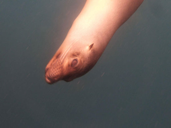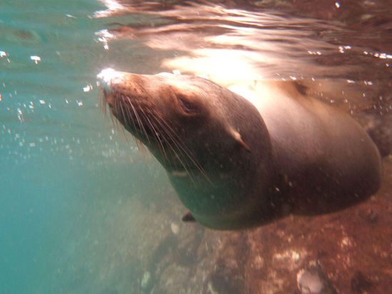 Ich treibe weiter an den Flanken von Leon Dormido. Plötzlich platscht etwas unerwartet neben mir ins Wasser. Ein Schatten im Augenwinkel. Ich drehe mich und habe im Abstand von ungefähr 1 Meter die Schnauze eines Seelöwen vor mir. Er beäugt mich schäl, taucht mehrmals unter mir durch, dreht wieder um, schaut mich an, lässt sich treiben, schwimmt in Kreisen um mich herum. Plötzlich taucht ein zweiter Seelöwe von der anderen Seite auf. Mitten zwischen beiden weiß ich vor lauter Aufregung und Freude gar nicht wo ich zuerst hinschauen soll, welchen der beiden ich zuerst fotografieren soll.....und so entschließe ich mich kurzer Hand die Kamera in den Videomodus zu schalten und mich zwischen den beiden treiben zu lassen. An diesem Tag (Nachtrag: bzw diese Woche ) werde ich noch öfters beim Schnorcheln auf Seelöwen treffen - jedesmal ein tolles Erlebnis, die an Land schlafend herumliegenden, schwerfälligen und nach Fisch stinkenden Faulpelze unter Wasser mit einer Wendigkeit, Geschwindigkeit und Aufgewecktheit zu erleben.