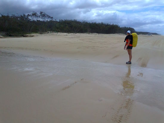 Da es morgens am Lake Mckenzie geregnet hat, war unser Zelt natürlich nciht trocken, aber wir mussten weiter und haben es so eingepackt. Wir haben uns dann auf den Weg tiefer in die Insel und den Regenwald gemacht. Die Wegangaben sind immer Luftlinie so wie es scheint. Da braucht man dann für 7 Kilometer schonmal 3 Stunden. Als wir dort ankamen gab es einen Barbecue auf dem wir dann Wasser abgekocht haben. Es fing dann um sechs Uhr abends an zu regnen und hörte nicht mehr auf bis zum nächsten morgen um halb sieben. Nach ca. 4 Stunden Dauerregen ist das Zelt langsam undicht geworden und wir mussten einen Poncho auf das Zeltdach legen, um nicht irgendwann wegzuschwimmen... Morgens war dann alles patschnass. Aber es hilft ja nichts, wir mussten wieder mal weiter. Diesmal lagen 10 Kilometer Regenwald vor uns. Ca. 4 Stunden später (viele schöne Regenwaldeindrücke, aber auch quälende Kilometer mit vielen vielen Spinnen), kamen wir dann an der anderen Seite der Insel in Eurong an. Dort gab es einen Shop, eine kleine Bäckerei und Fast Food. Und was für uns das wichtigste war, es gab einen Waschsalong. Dort haben wir uns für ca. 2 Stunden eingenistet, haben unsere Sachen getrocknet und gewaschen. Zähne geputzt und uns von dem ganzen Sand befreit. Wir haben uns dann auch bei dem "Restaurant" den Bauch vollgeschlagen, weil wir natürlich die drei Tage vorher fast nichts zu essen hatten. Als wir die wasservorräte wieder aufgefüllt hatten mussten wir dann noch ein paar Kilometer am Strand Richtung Norden bis wir dann einen Platz fanden, an dem wir hinter den Dünen campen konnten. Das schlimmste Problem sind hier die Bremsen, die es dort überall gibt. Sie sind sehr aufdringlich und man kann nicht mal zwei Sekunden irgendwo still stehen, ohne dass sie einen belästigen.