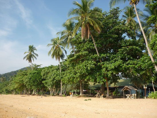 Gegen 16h am Ziel angekommen wurden wir nicht enttaeuscht. Die Insel und das Resort halten was der Reisefuehrer verspricht! Eine traumhaft schoene Bucht mit weniger als 10 Gaesten im Resort hat uns willkommen geheissen. Die Bungalows waren zwar sehr spartanisch eingerichtet, Strom gab es nur stundenweise und duschen war nur bei Tageslicht moeglich, aber egal. Das Resort ist einfach schoen! Ein ganz ruhiger Strand, toll zum schnorcheln und schwimmen und wir die einzigen Menschen am Strand.