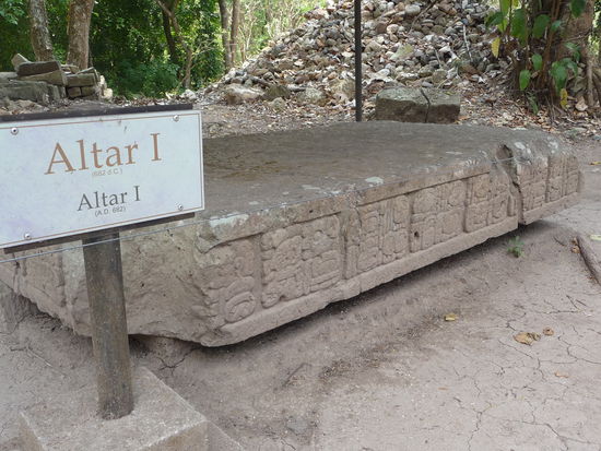 Altar Q vor Tempel 16 wurde vom 16. Herscher Yax Pak 776 in Auftrag gegeben und zeigt Ihn und seine Vorgänger in chronologischer Reihenfolge