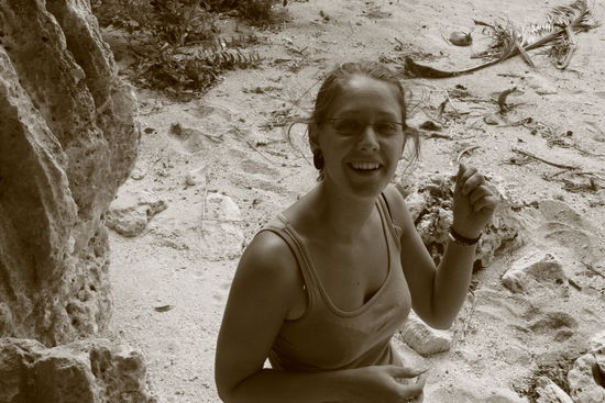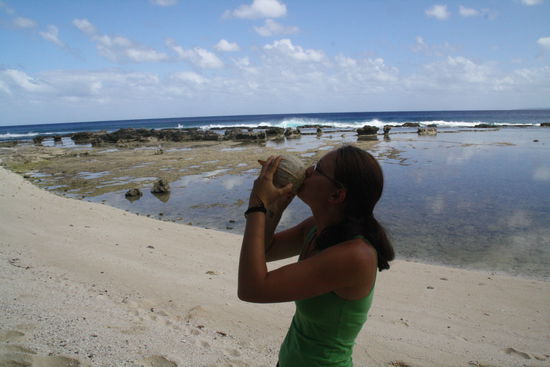 Katarina und ich versuchen unsere erste Kokosnuss zu öffnen. nicht einfach, denn da ist noch so ne dicke, fiese, schwer zu öffnende Faserschicht rum und wir haben uns echt mit dem Schweizertaschenmesser abgemüht. bis ein Euaner kam und meinte, gebt mal her und der hat unser Flederwerk ein paar mal gekonnt auf nen Stein gemasht und zack zack zack Kokosnuss zum Trinken bereit. Lecker!!!!