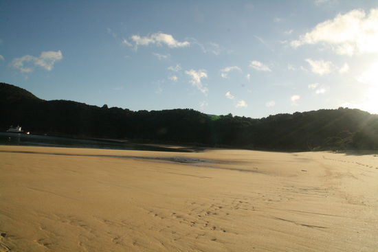 Unser Auto bleibt in Motueka auf dem kleinen Campingplatz stehen und wir lassen uns mit dem Bus zu Wainui Bay fahren und beginnen unseren ersten Great Walk. durch ein von Maori-schnitzereinen verziertes Holztor geht es los. Sonne scheint und warm ist es außerdem. so richtig schön.