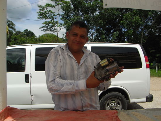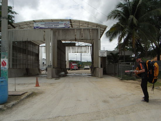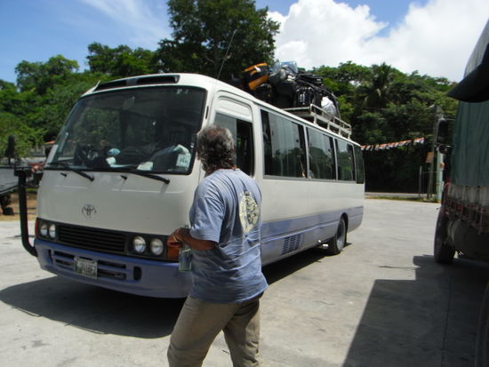 Mit geschrumpfter Personenzahl wollten wir gerade weiter fahren, als sich unser Busfahrer dazu entschied, einen kleinen unfreiwilligen Stunt vom Busdach zu praesentieren. Der arme Kerl ist naemlich beim Versuch, die Gepaeckseile nachzuspannen, rueckwaerts vom Dach gestuerzt, als eines der Seile riss. Zum Glueck hat er sich nicht ernsthaft verletzt und konnte uns somit noch tapfer ueber die Grenze nach Mexico (Chetumal) bringen.