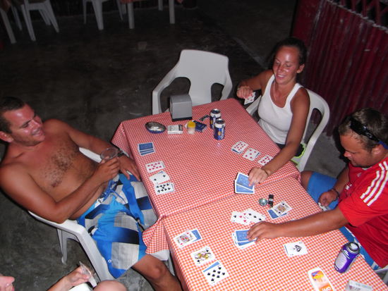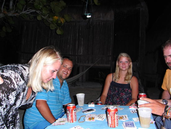 Bevor es zurueck zum Strand ging, haben wir uns erneut mit Getraenken eingedeckt. Wie sich herausstellte, war das "Mine-Spiel" nicht das letzte an diesem Abend. Es folgten "diverse" Karten- und Wuerfelspiele, die fuer den Ein oder Anderen gewisse Herausforderungen darstellten. Naja, ihr wisst ja, wie solche Abende ablaufen... Spielen, Trinken und im Meer nackt baden; zur Freude der Schildkroetenpolizei
