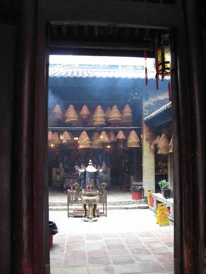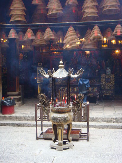 2011 - Man Mo Tempel; unter der Decke hangen riesige Räucherspiralen, in denen Botschaften an die Ahnen und Götter auf rotem Papier aufgeschrieben sind und die durch den Rauch ins Jenseits aufsteigen sollen.