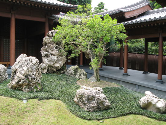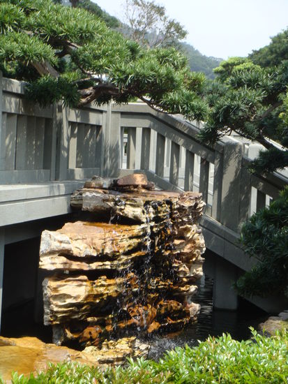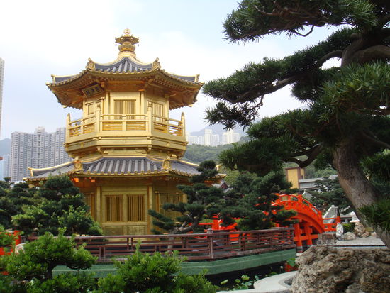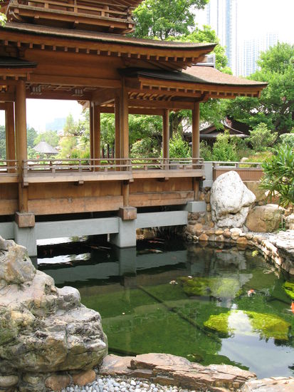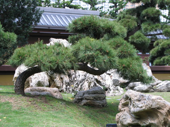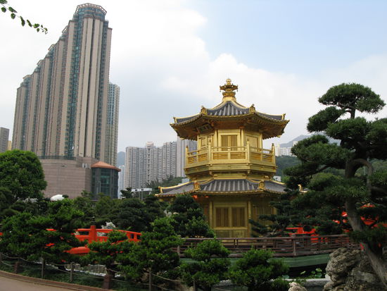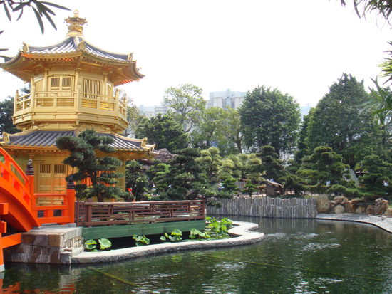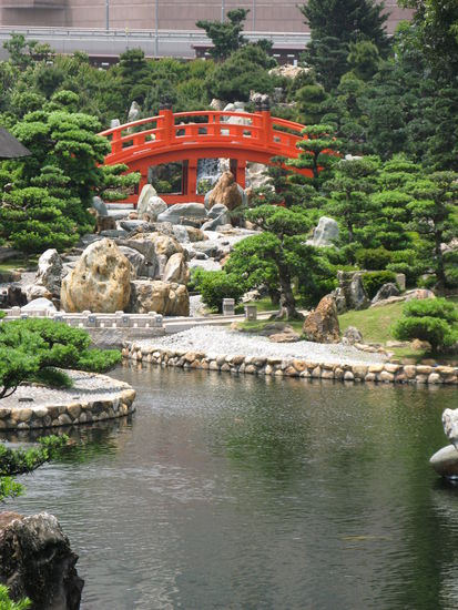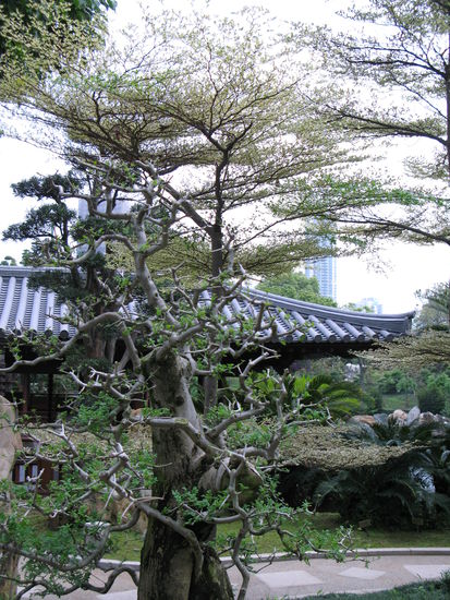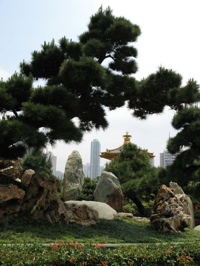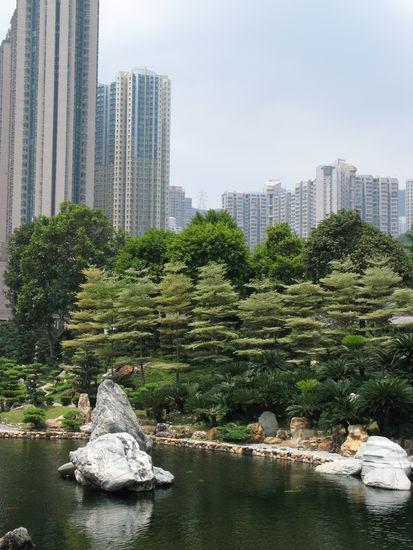 Die Kombination mit nach chinesischer Art gezogenen Bäumen, Sträuchern, ausgewählten Steinen, Teichen und Brücken entspricht einer Oase der Ruhe und Harmonie, obwohl ringsherum der Verkehr auf den Autobahnen dahinbraust! Die Silhouetten der Hochhäuser geben einen ganz speziellen Rahmen dazu!