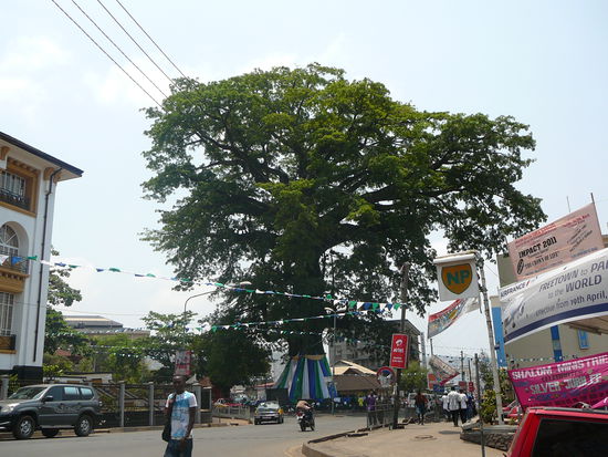 Wenn schon ein Baum als Hauptsehenswürdigkeit einer Stadt herhalten muss, sagt das etwas aus über deren Attraktivität. Aber damit tut man Freetown Unrecht. Denn erstens ist der "Cotton Tree" tatsächlich ein mächtiger, vielleicht 500 Jahre alter Baum, an dem im Hellen unzählige Fledermäuse kleben, die nachts umso aktiver werden. Er steht mitten im Geschäftszentrum und taugt gut als Orientierungspunkt.