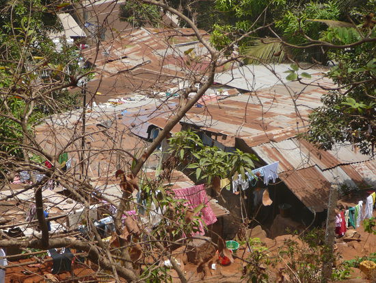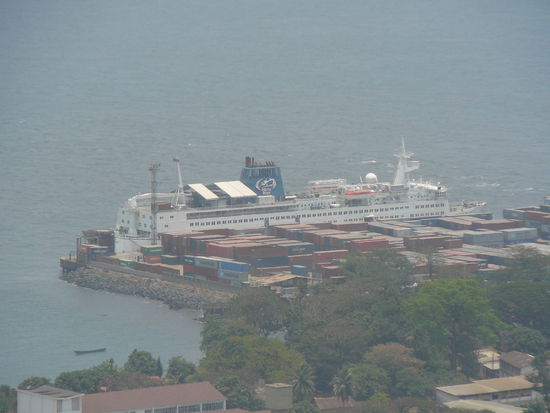 Am Hafen erkenne ich in der Ferne ein großes Schiff. Nanu, hat sich schon ein Kreuzfahrtschiff hierher verirrt ? Ich glaube nicht, ich vermute eher, es ist ein "Mercy Ship", auf dem oder von dem aus ärztliche Versorgung geleistet wird. Eine Erinnerung daran wie es unten wirklich aussieht, denn die Slums fallen von hier oben gar nicht auf.