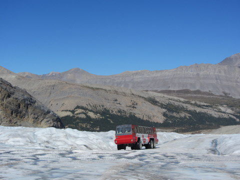 Columbia Icefield gegen 16 Uhr erreicht. Das Eisfeld ist um die 325 km2 groß und 100-365 m dick und speist mehrere Flüsse gleichzeitig, welche in den arktischen Ozean, den Antlantik und den Pazifik fließen (ihr seht ich hab gut aufgepasst). Das Eisfeld selber kann man allerdings nicht sehen von der Straße, sondern nur drei seiner Gletscher, den Athabasca, auf dem Petra und ich waren, den Dome und den Stutfield.
