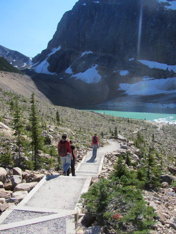 War ganz nett dort, aber nichts besonderes. So waren wir nach 2 Std auch fertig mit unserer Erkundung. Noch schnell beim Tim Hortons Donuts gegessen und dann gings weiter zum nächsten Stop, dem Edith Cavell Glacier, der kurz vor Jasper liegt. Auf einer 14km lange Straße ging es bergauf zum Parkplatz. Die war leider so kurvig das mir erstmal schlecht wurde. Hat sich dann aber glücklicherweise schnell wieder gelegt.